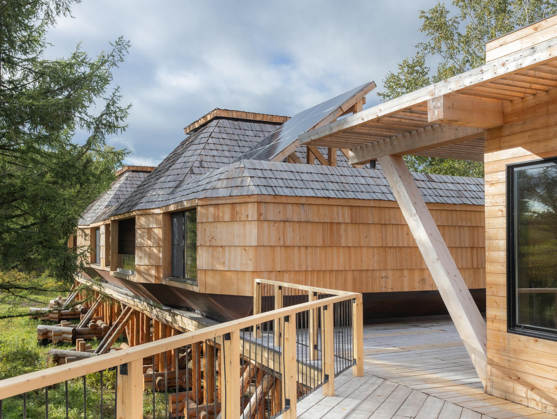 The Aurora hotel concept references the traditions of Itelmen and Koryaks, indigenous to Kamchatka, as well as bridge construction in Ancient Rus. A spacious 2,500-square-metre larch platform, seemingly floating above the ground, provides not just accommodation but also breathtaking vistas. This innovative design choice ensures minimal environmental impact while providing guests with unparalleled views of the surrounding landscape. The elevated position of the platform offers a unique perspective, enhancing the overall experience of being immersed in nature's grandeur.
