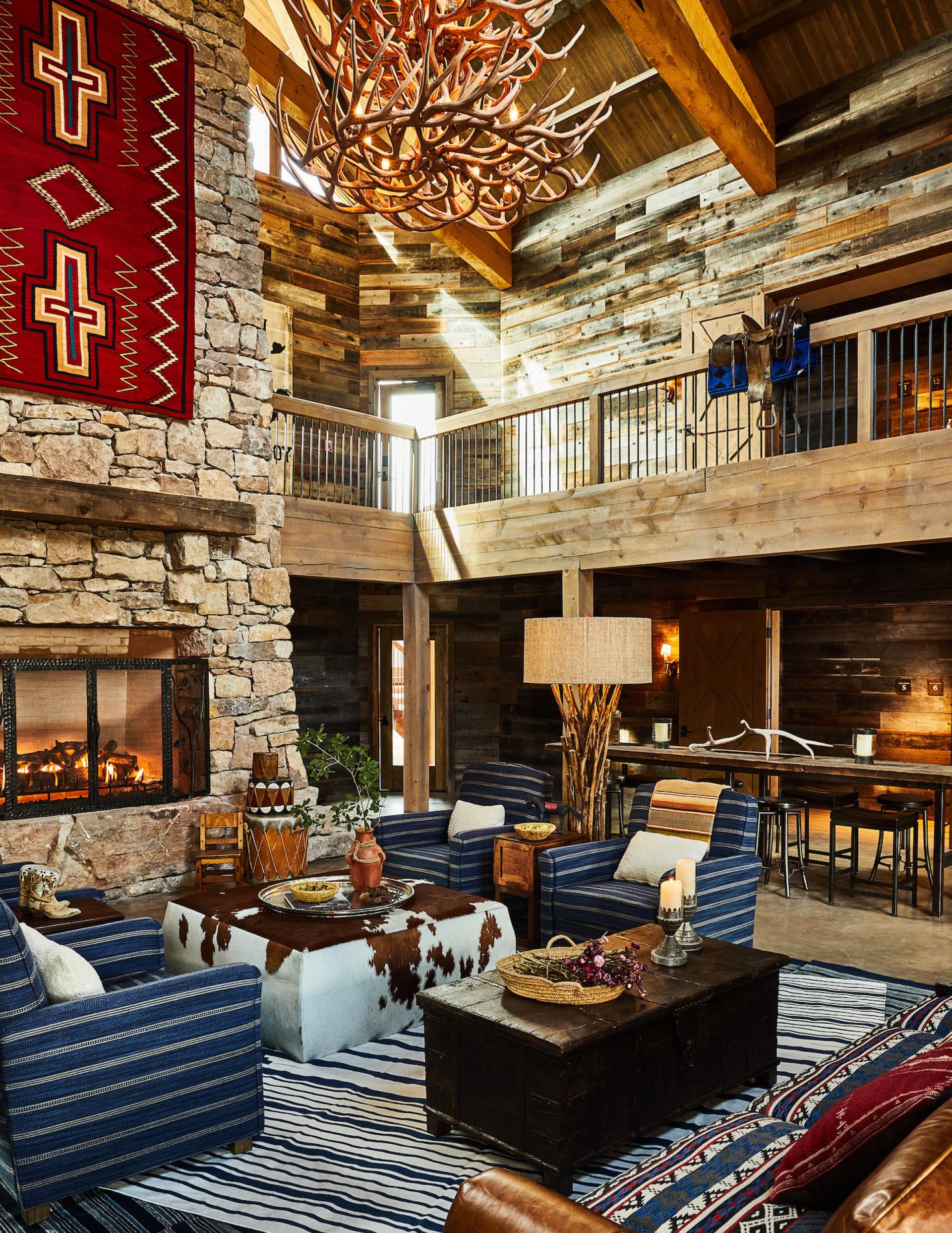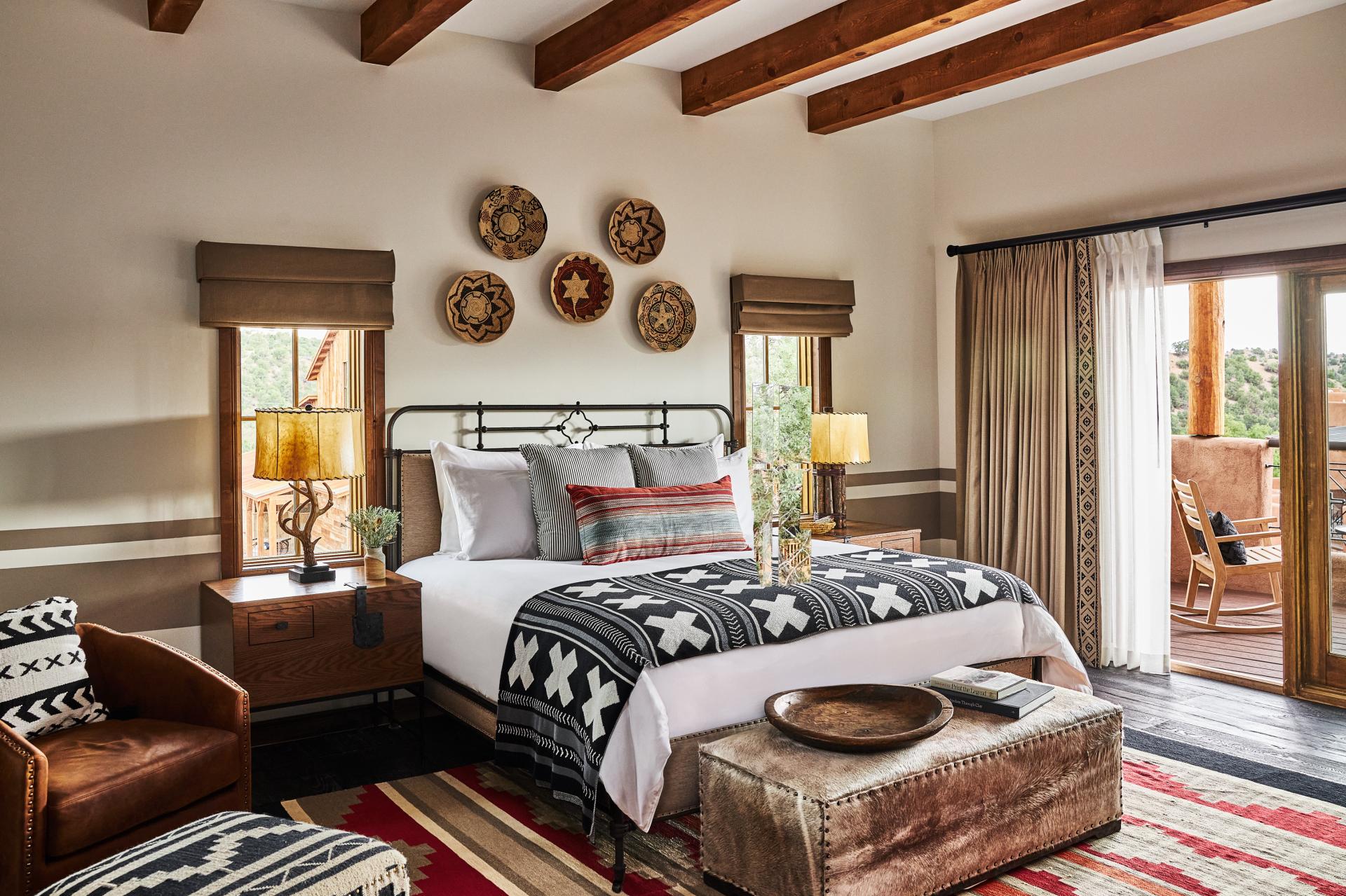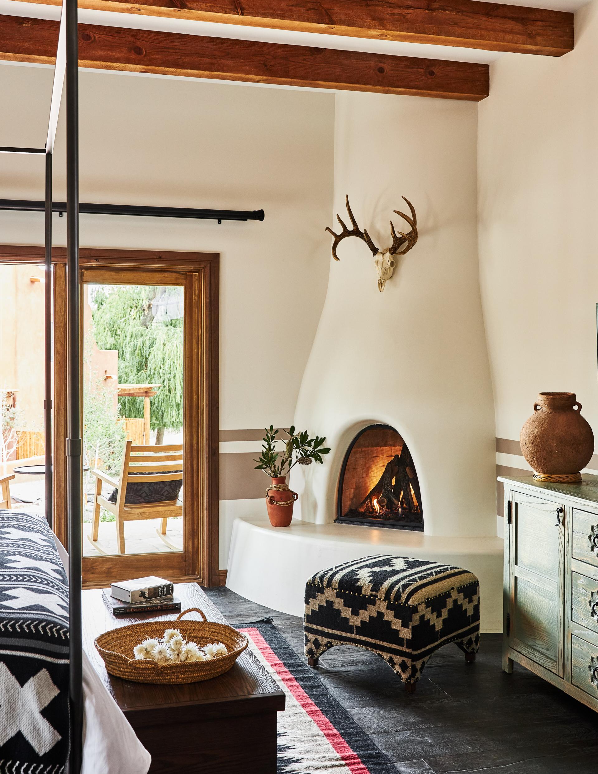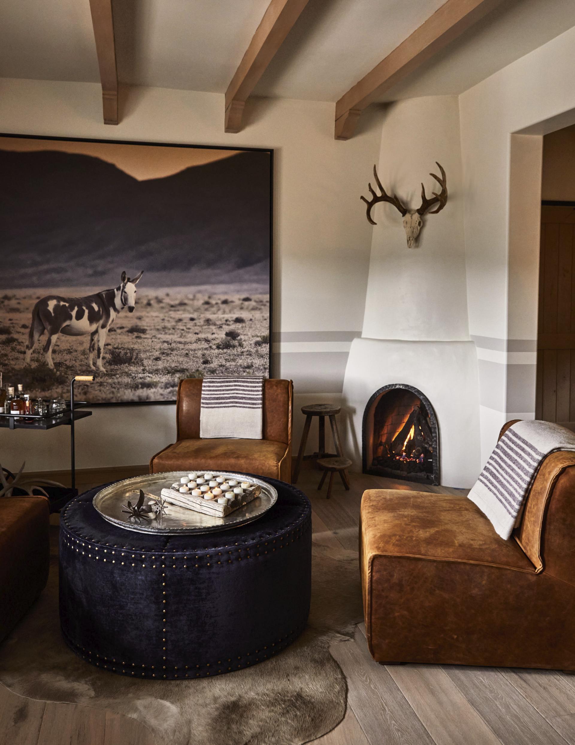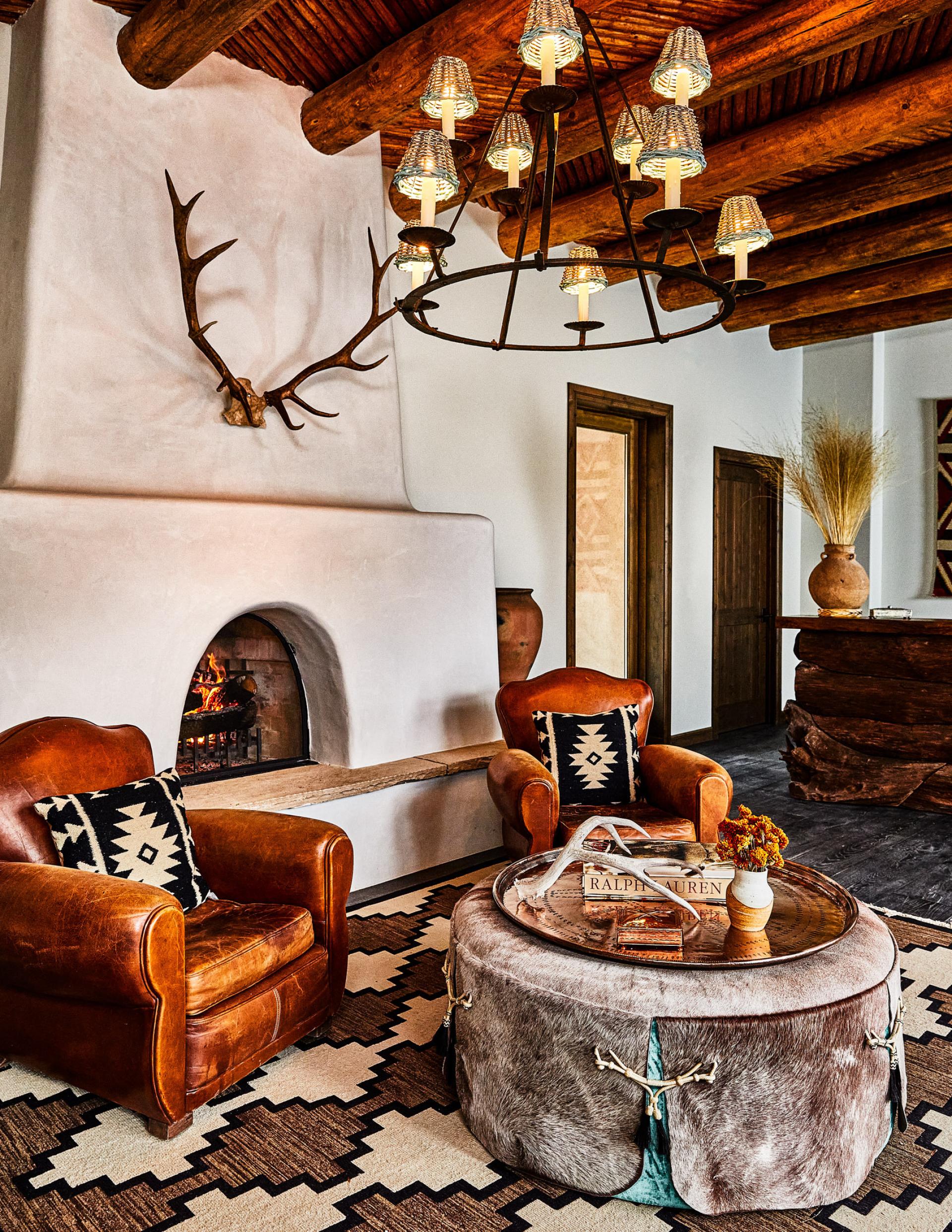 Inspired by Santa Fe’s layered cultural identity, shaped by Native American, Spanish Colonial and early-American influences, the interiors reference the region’s artistic lineage, including the iconic style of Millicent Rogers. Prairie silhouettes, Navajo motifs and desert colorways are woven throughout custom furnishings, regional artwork, vintage rugs, handcrafted textiles and curated Native American artifacts.