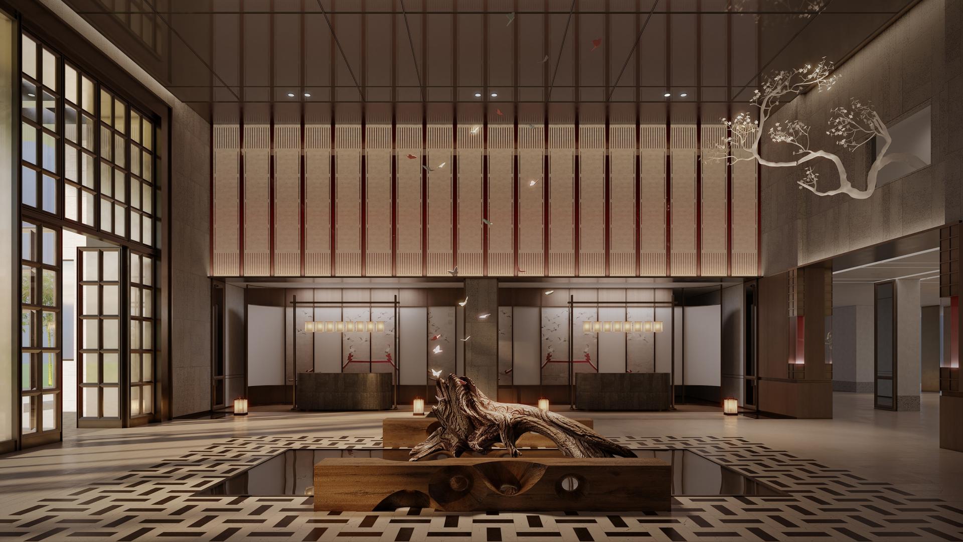 The spatial language is grounded in a neo‑Chinese style, structured with modern minimalism, and embellished with the essence of traditional elements, fostering an atmosphere that is elegant, dignified, yet stylish. The lobby features a focal point: a three‑dimensional butterfly installation crafted through colored stone inlay — symbolizing transformation and sublimation — where traditional craftsmanship meets contemporary sculptural expression, forming a dual visual and cultural signature. In the dining area, Ou sculpture’s delicate textures add warmth and layered richness, while blue Jiaxie dyeing and weaving are subtly incorporated into art pendant fixtures and fabric details; the fresh, refined color palette endows the space with both modernity and cultural resonance. Guest rooms emphasize privacy and comfort, pairing handcrafted bamboo screens and local artistic touches with muted tones to create tranquil cultural sanctuaries.