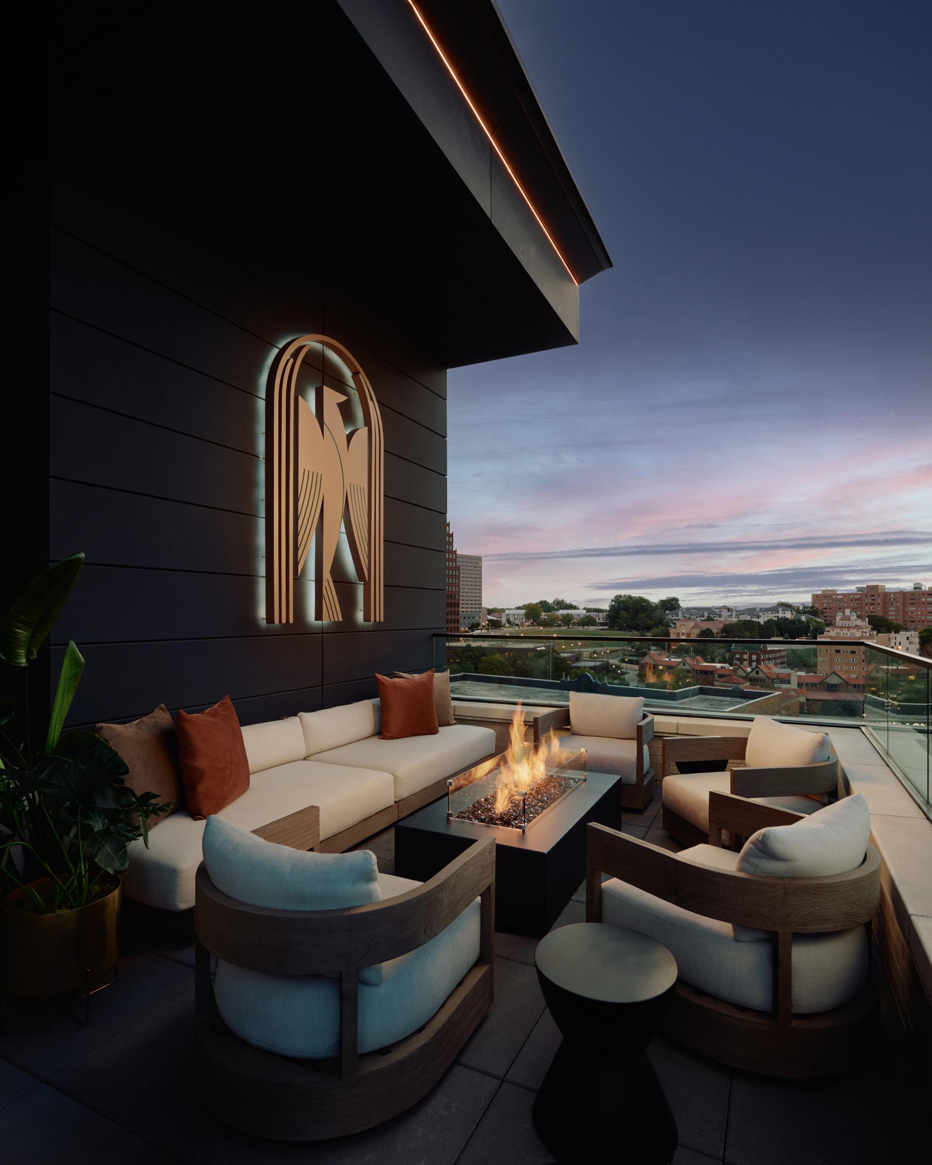 Perched high above Kansas City’s renowned Country Club Plaza, Momentum KC crowns the tenth floor of the Cascade Hotel. This semi-private rooftop lounge was conceived as an elevated social retreat—intimate yet lively, refined yet expressive. The design draws inspiration from the quiet vigilance of a bird in flight, translating movement, observation, and poise into a layered interior environment where materiality, form, and atmosphere work in concert.