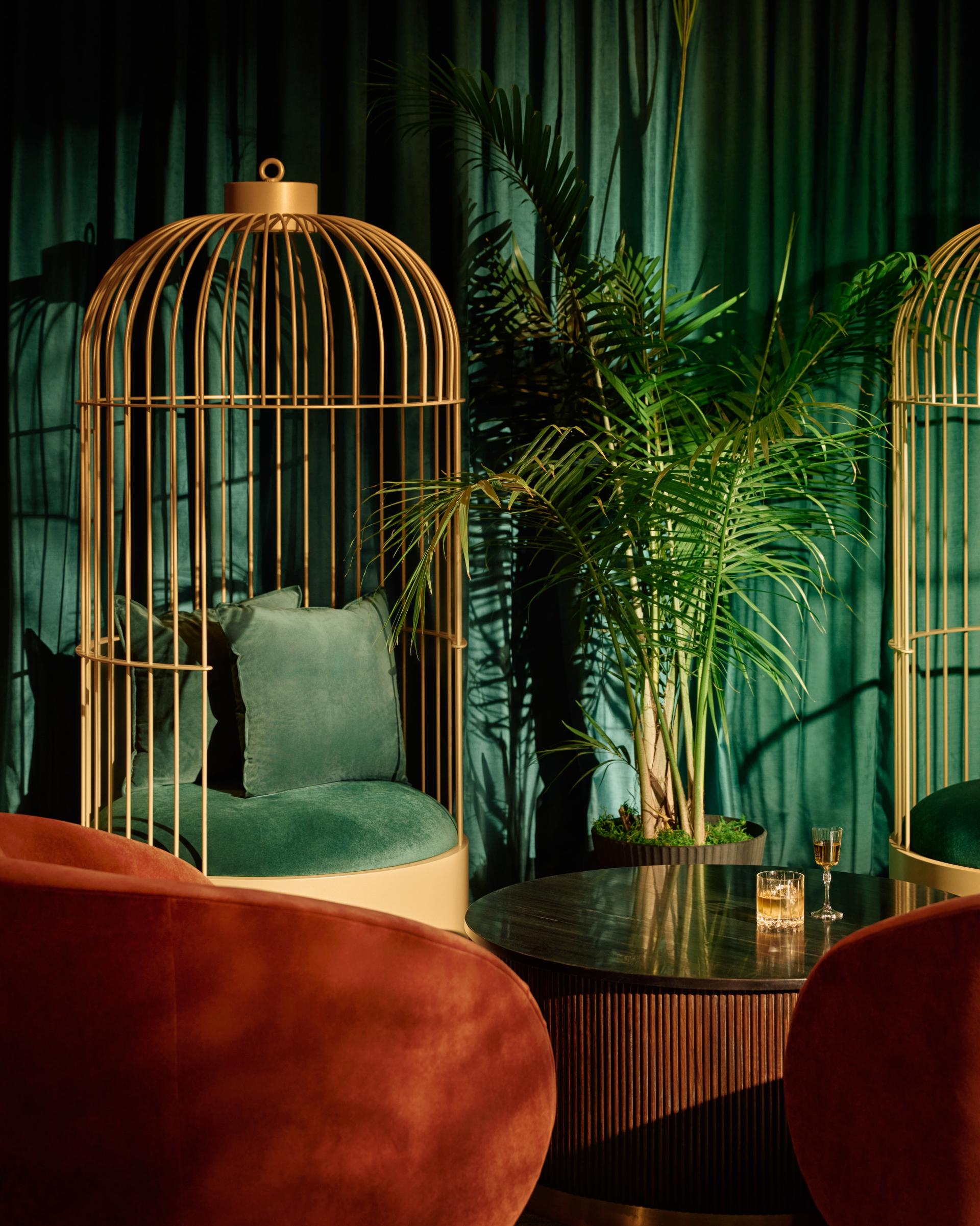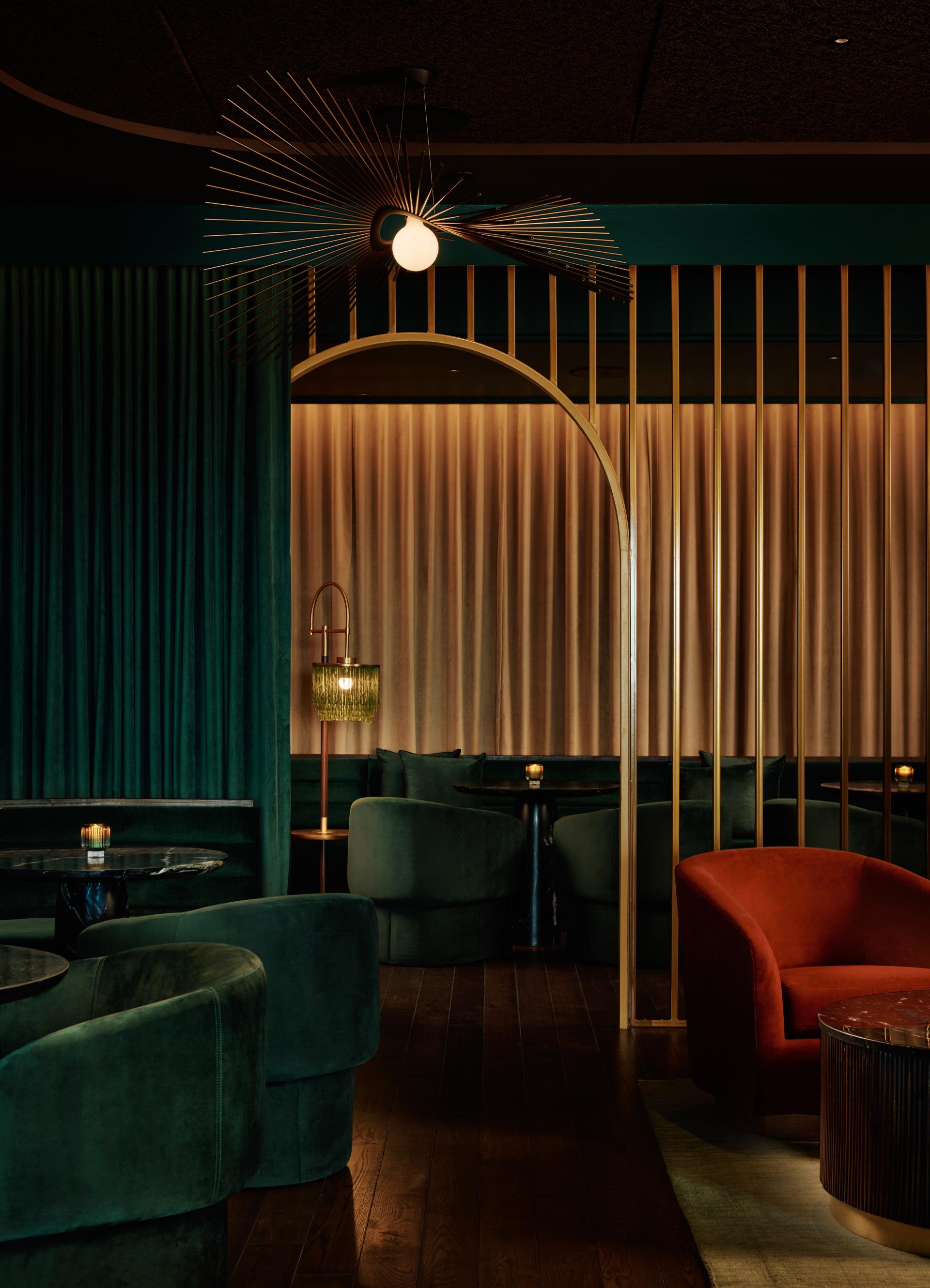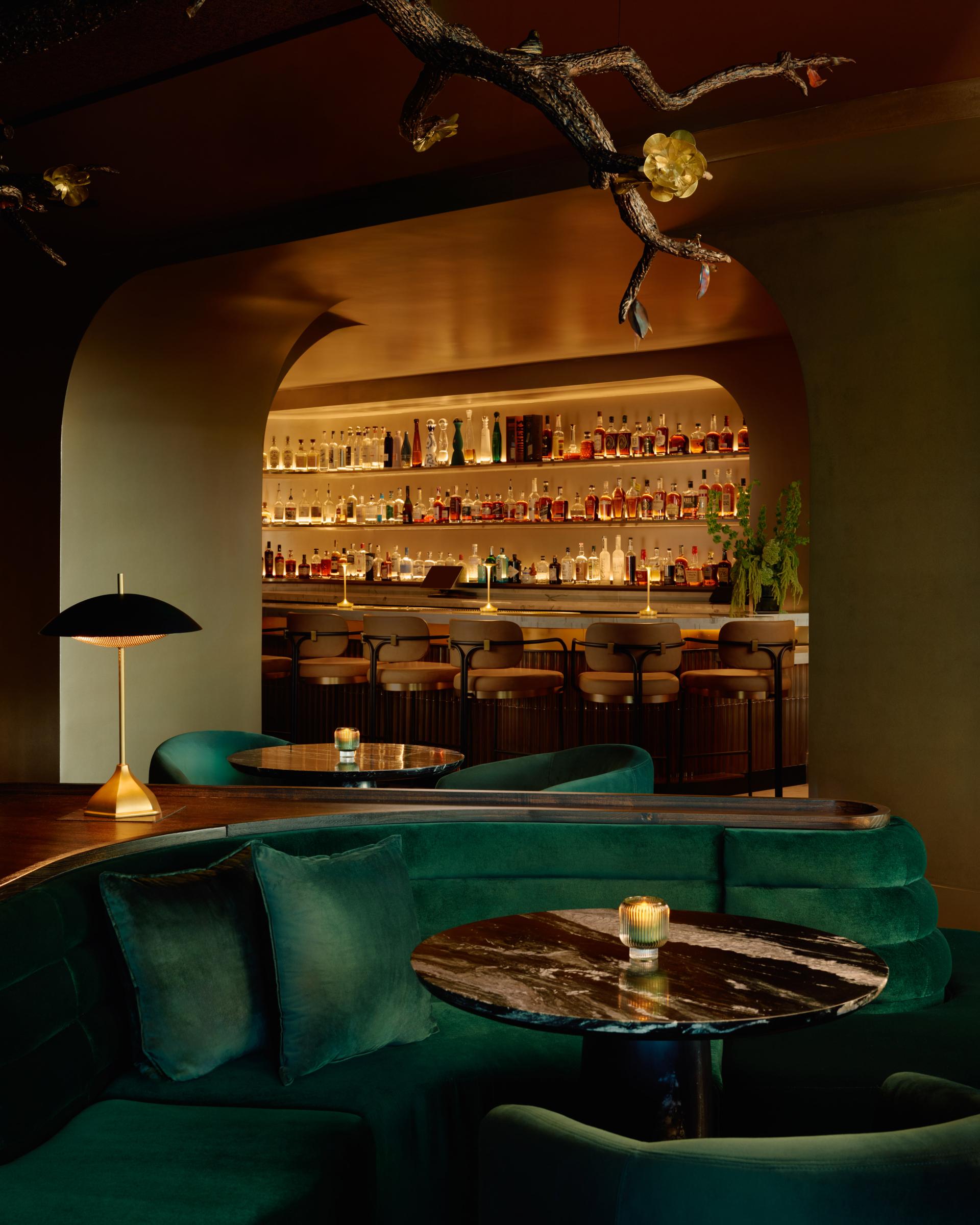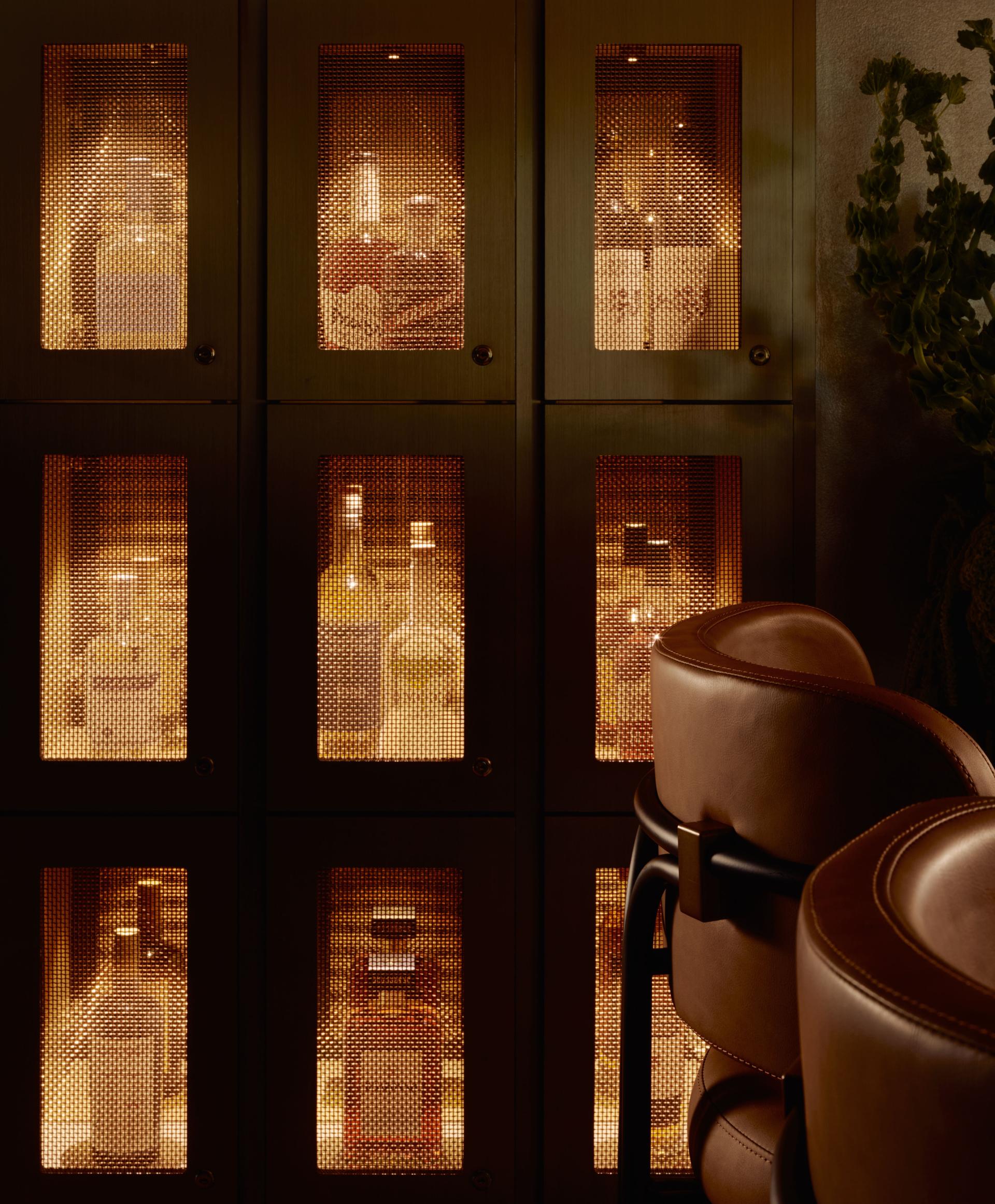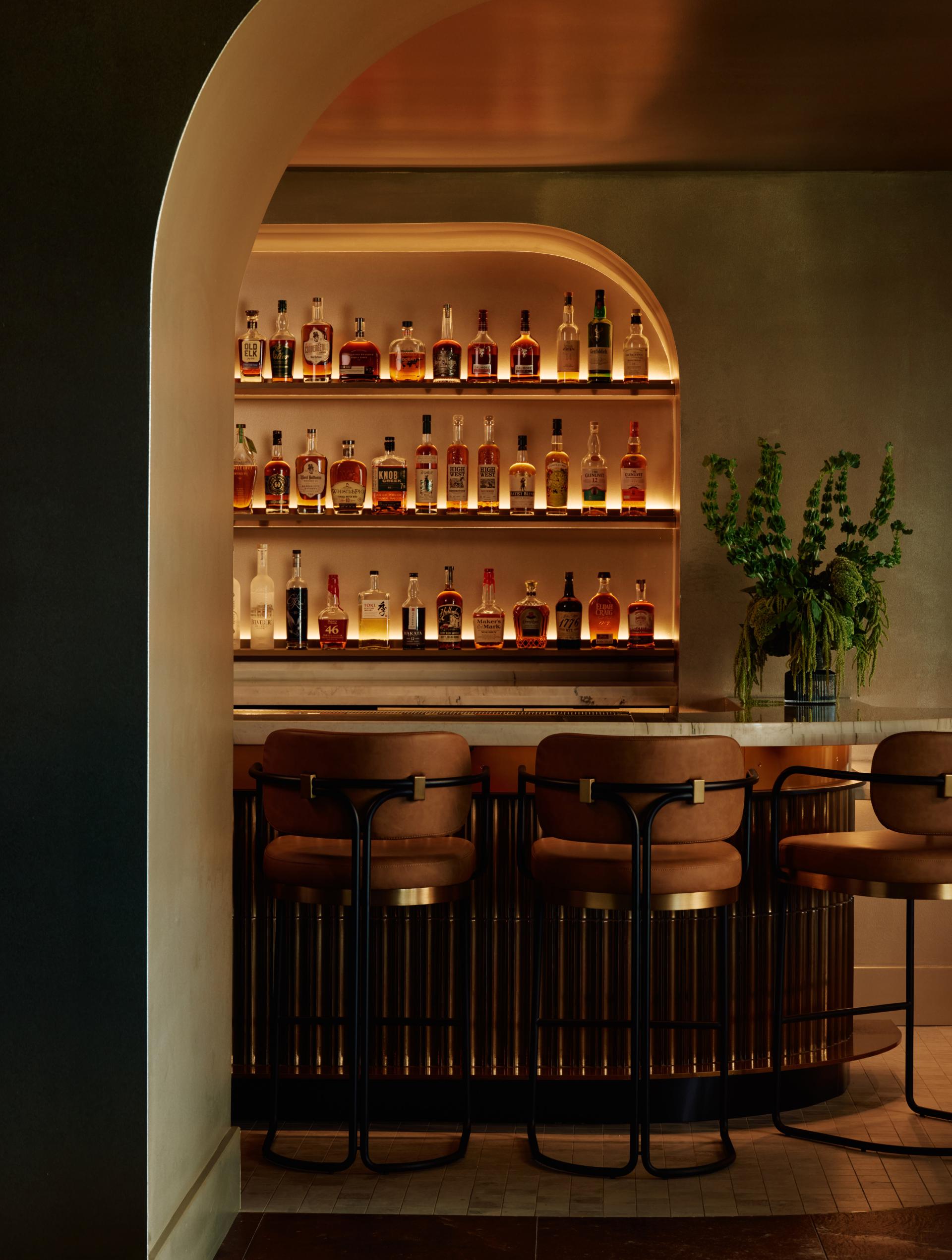 Moments of discovery are layered throughout. An arched portal lined with custom floral wallcovering dusted in metallic mylar leads to elevated restrooms, extending the material story beyond the main lounge. A bottle keep of personal reserves provides members with a sense of ritual and return, blending storage with identity. Enclosed by brass screening and velvet drapery, the private dining room effortlessly flexes between refined privacy and engagement—open to the pulse of the lounge or softly secluded as needed.