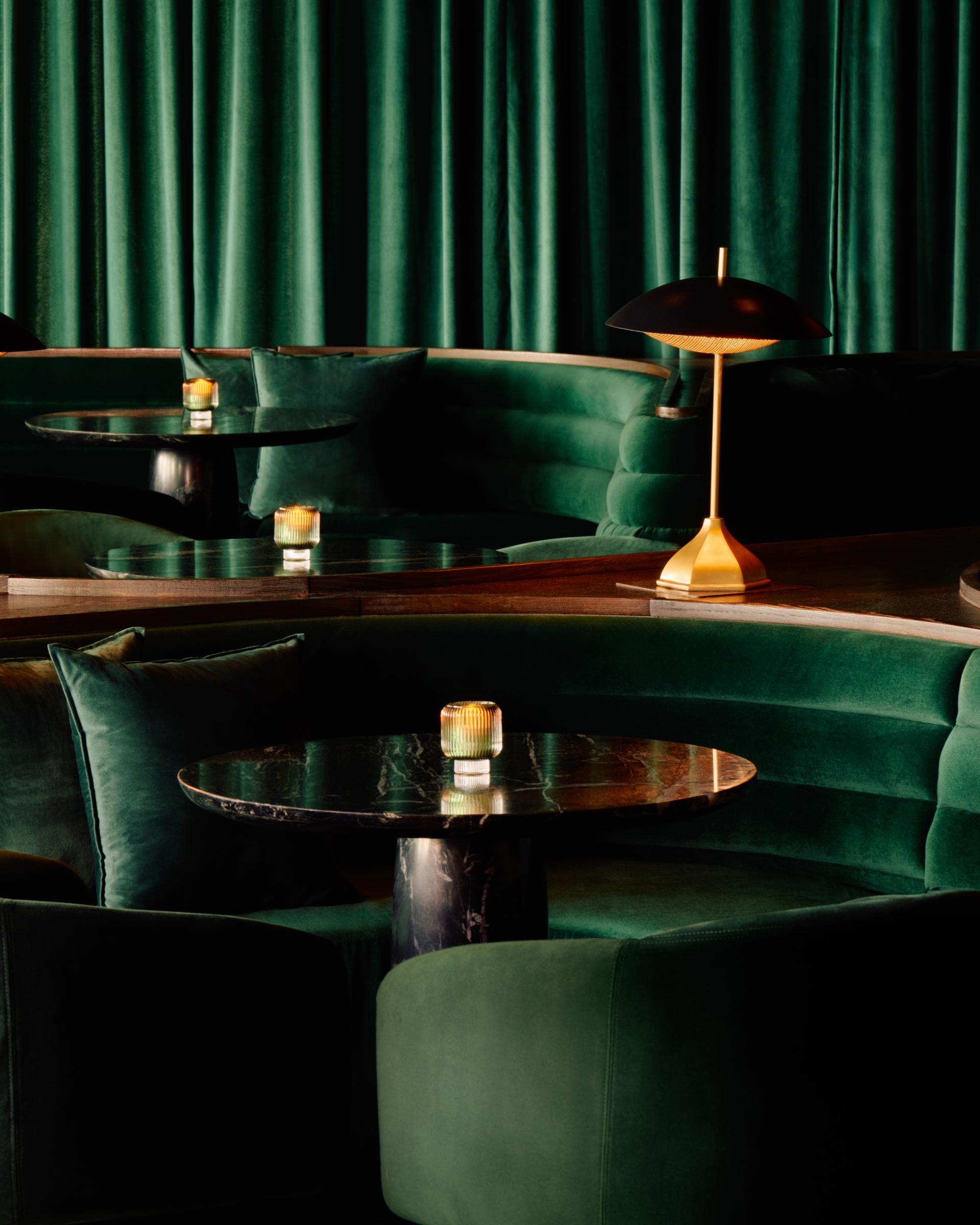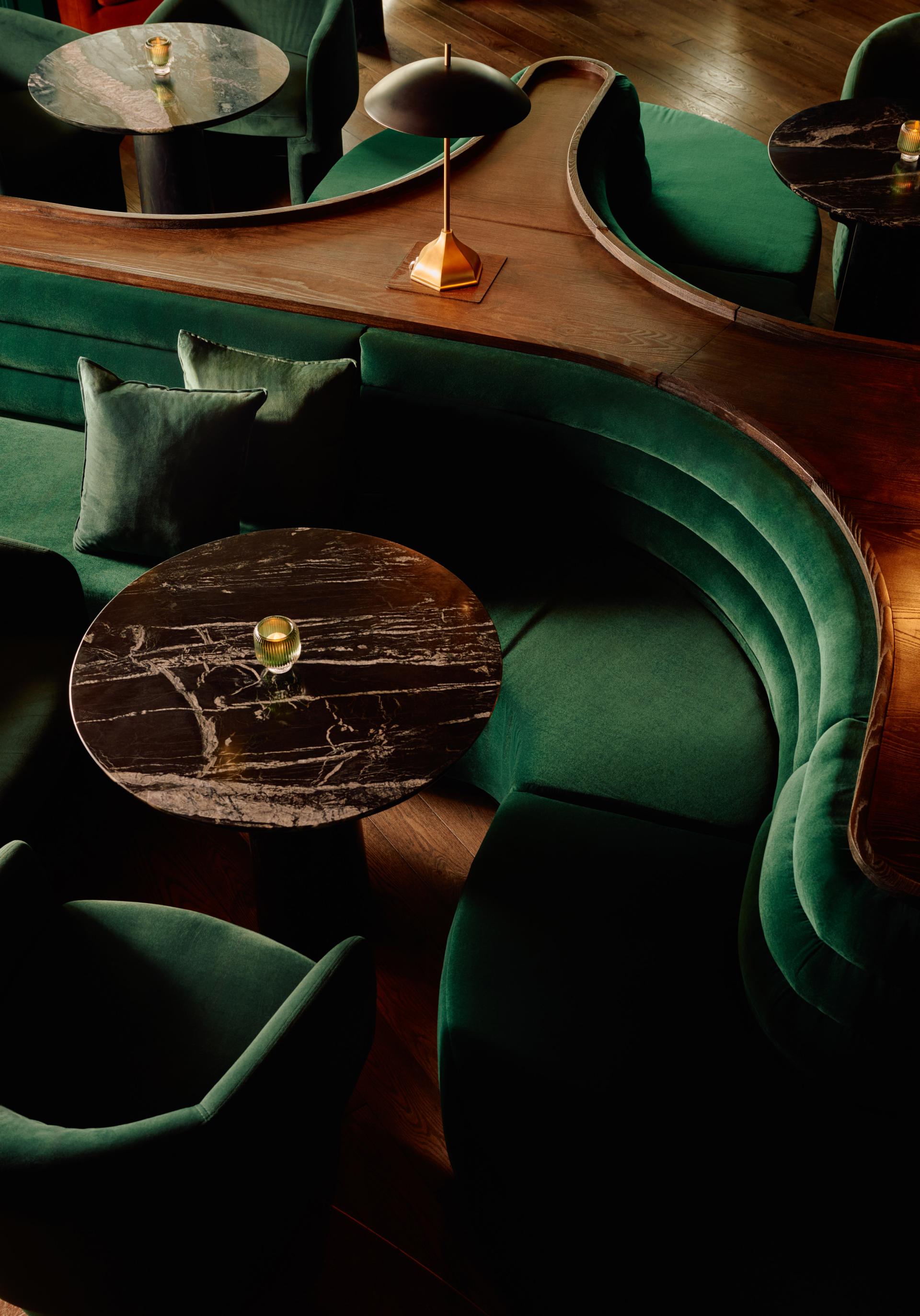 Arrival unfolds as a gradual reveal. A mosaic stone floor sweeps through the lounge, guiding guests toward a dimly lit bar and seating area arranged to encourage both conversation and contemplation. The stone references the surrounding district’s Spanish-influenced architectural heritage, introducing a contemporary rhythm through scale and pattern. Throughout the space, a saturated emerald palette envelops walls and banquettes in velvet, creating a cocooning effect that heightens intimacy and acoustical comfort while reinforcing the club’s immersive identity.