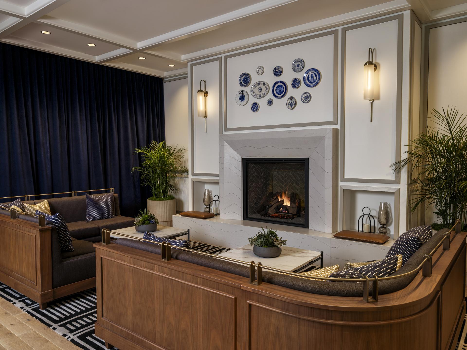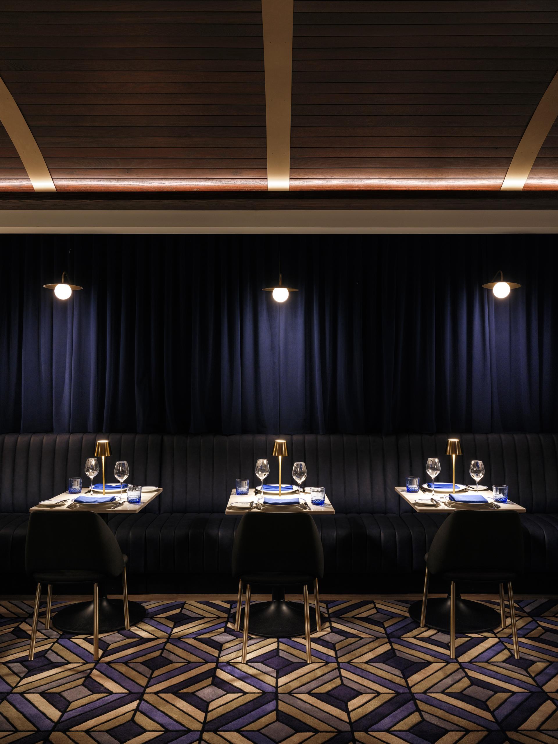 Serving as both focal point and spatial anchor, the bar is defined by a rectilinear form with softened corners that balances structure and fluidity. A white stone bar top rests on warm wood paneling, illuminated from below to create a floating effect and highlight the brushed gold foot rail. The bar’s geometry is reflected above in a ceiling-mounted gold accent and suspended sculptural form, reinforcing continuity through the space. Behind the bar, backlit bottle shelves are recessed within a white half-circular frame, with blue-accented seating and mosaic details adding contrast and visual depth.