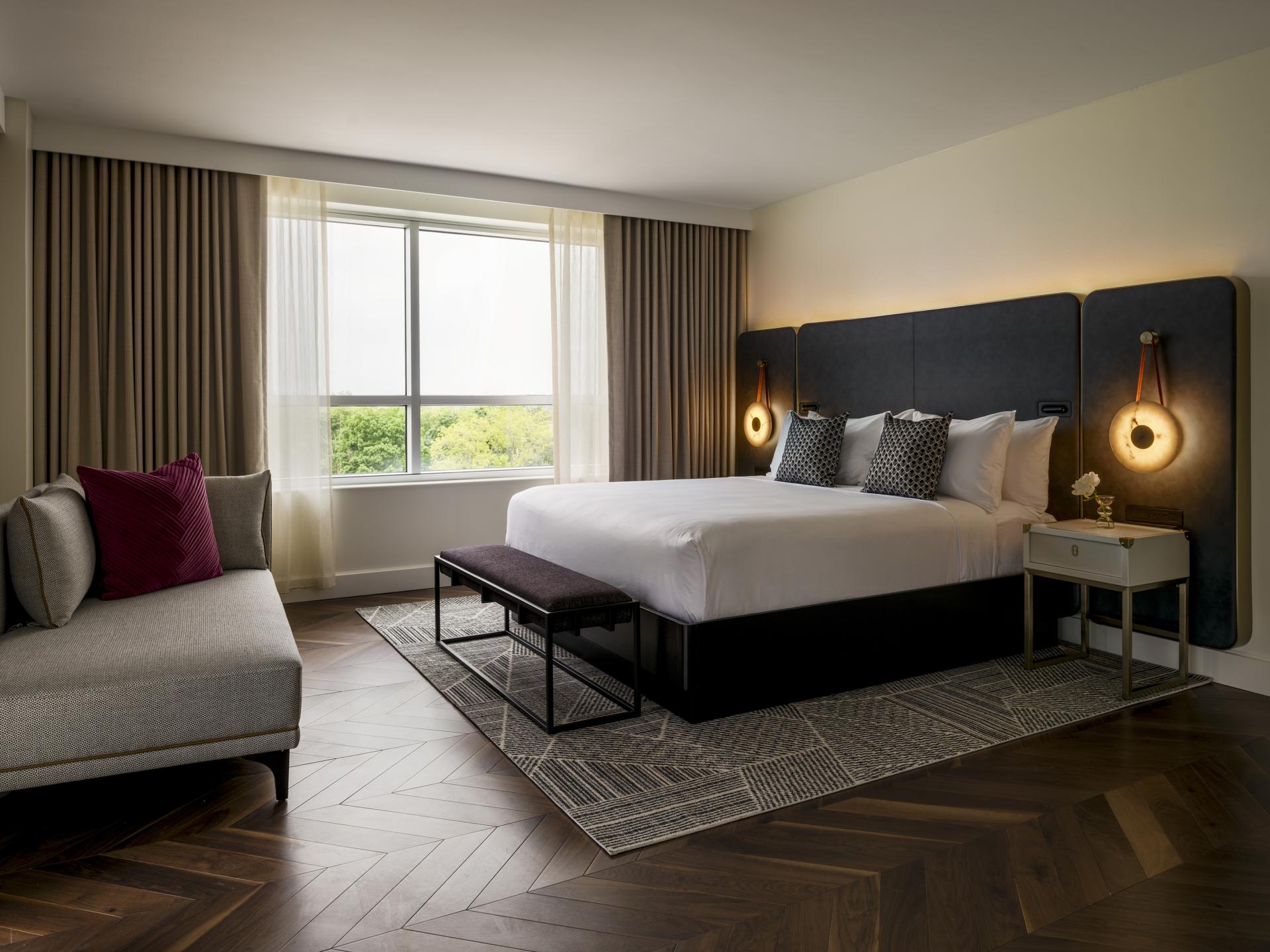 In the guestrooms, global references are expressed through thoughtful details: modern writing desks, vintage trunk-inspired minibars, and a curated collage of artwork – letters, found imagery, and a portrait of James Burrill Angell – that brings a living, breathing narrative to the space. Chevron wood patterns on floors and closet doors echo the folds of envelopes, while Juliette balconies and private terraces offer moments of quiet reflection above the city.