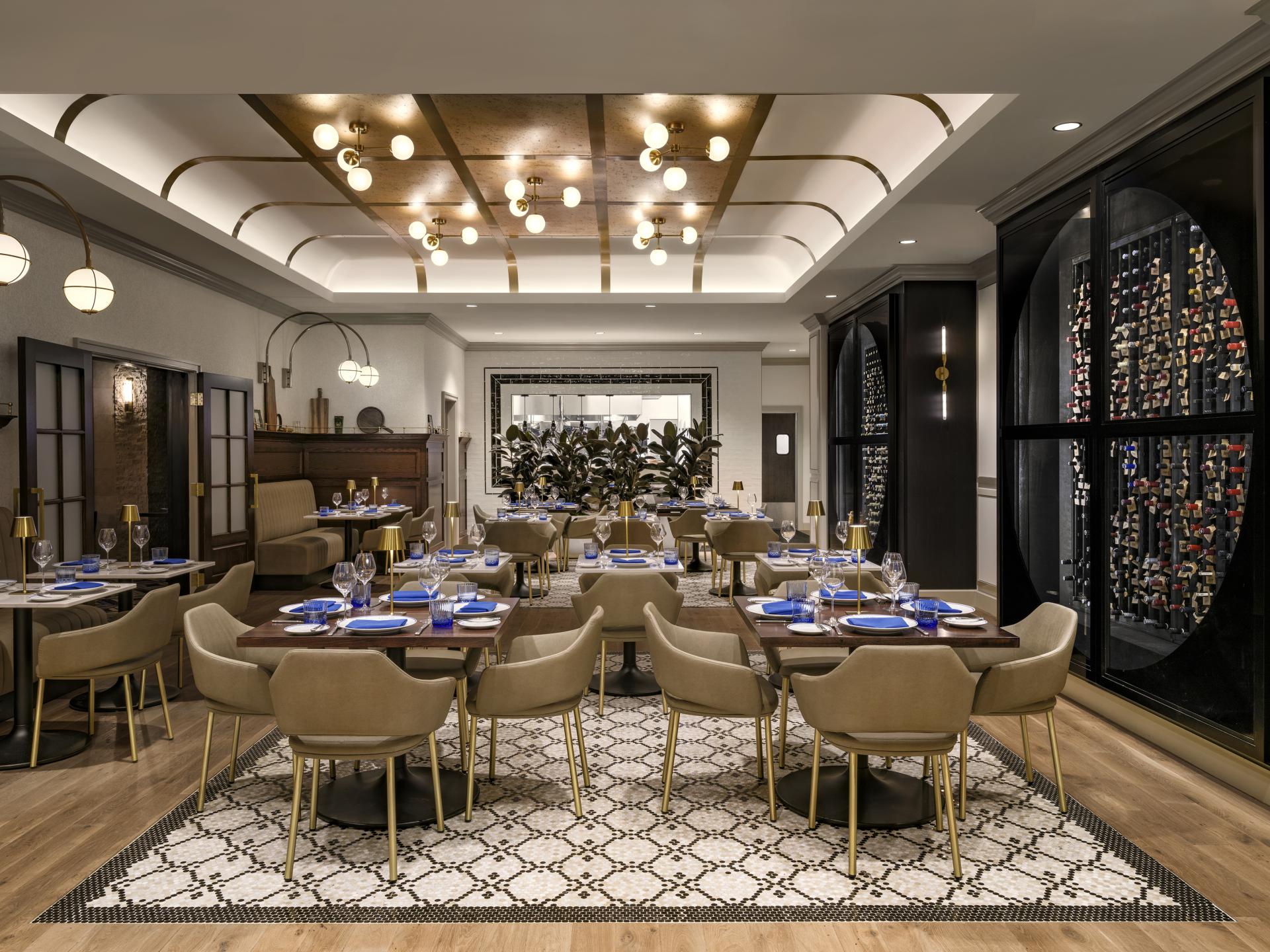 The experience begins in the sunlit lobby, where every surface, shadow, and artifact hint at a journey of curiosity waiting to unfold. Sweeping arched openings shape the path through the main floor, presenting moments of pause and passage that guide movement and invite exploration. A hand-crafted reception desk recalls vintage French travel trunks, detailed with warm wood, textured touches, and custom compartments that suggest a place for safeguarding life’s treasured finds. Through a softly lit black mosaic portal, guests discover La Serre, a French brasserie that draws from the natural world with Parisian charm. From a cobblestone entry to a sweeping brass-accented bar, the space evolves into two distinct private dining experiences: a lush solarium drenched in greenery and a moody, velvet-lined wine cellar that captures the warmth and stillness of a fine wine at rest.