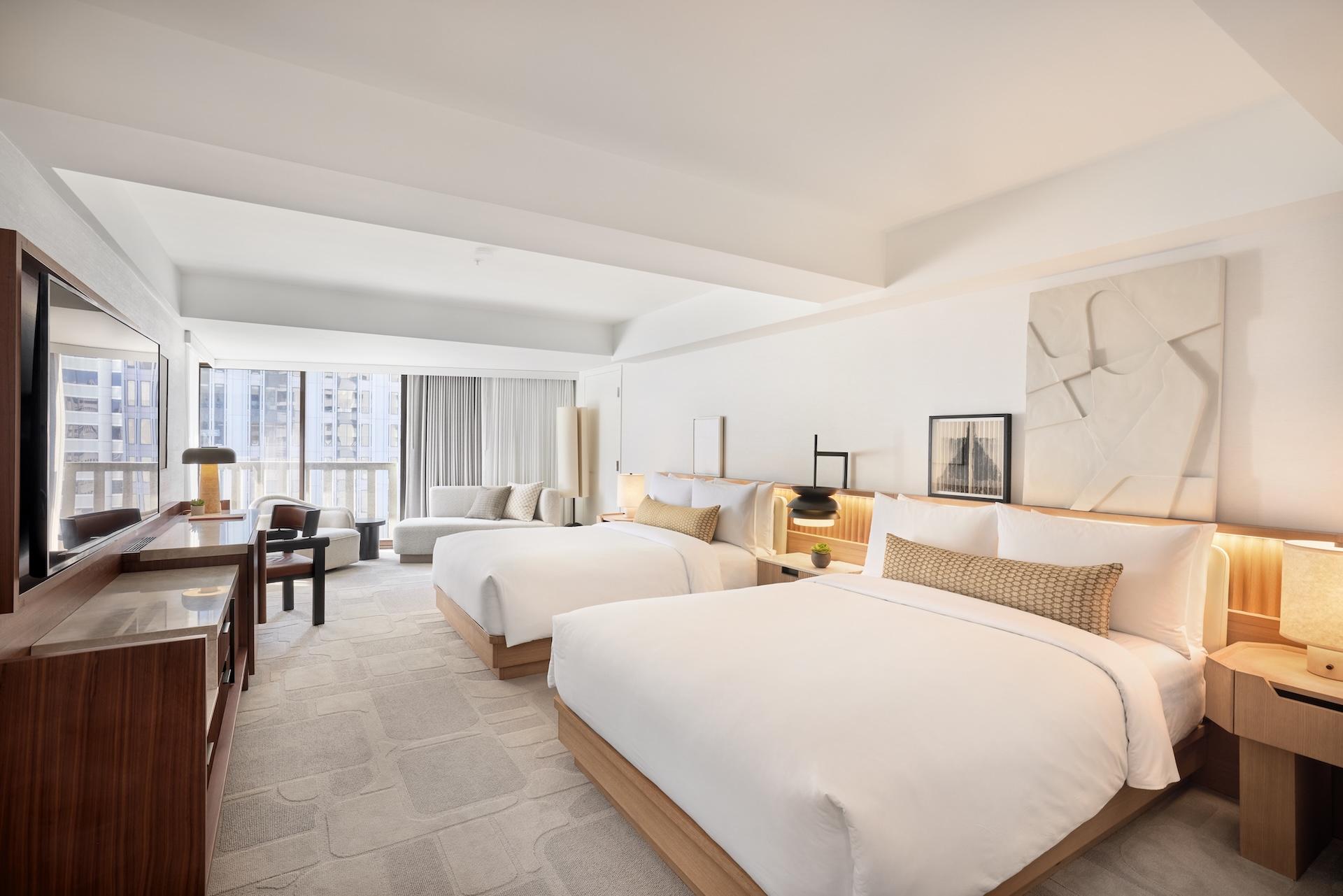 Guest rooms offer angled floor-to-ceiling windows giving guests glimpses of the Bay, Coit Tower and the downtown skyline, while also providing copious natural light on each level. Featuring warm wall coverings, soft furnishings and clean lines, guest rooms offer vignettes of space for rest, relaxation and work. The color palette highlights creams, burgundy reds, blacks, bronze, whites and warm woods that bring a casual air to the refined, modern design details, creating a distinct ambiance throughout the rooms.
