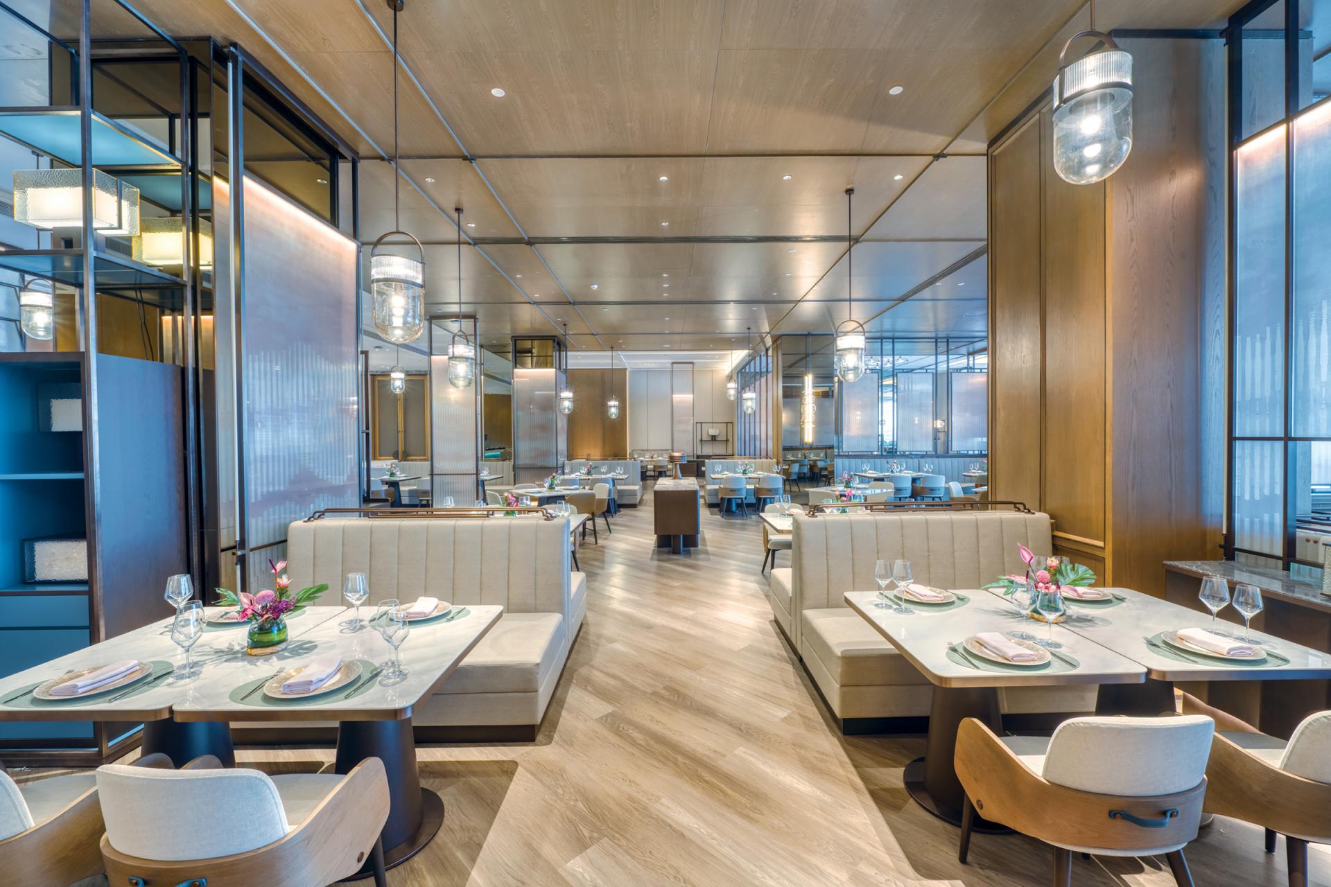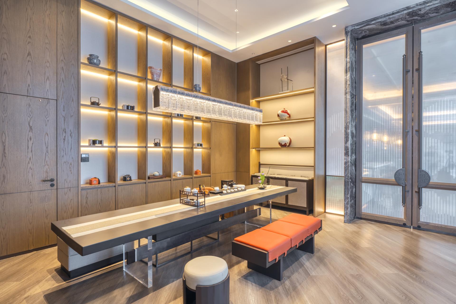 Public zones translate specific garden pavilions. The lobby lounge and all-day dining restaurant reinterpret the symmetrical, waterside Mirror Pavilion. Here, a central boat-shaped bar anchors the space, flanked by banquettes behind semi-transparent screens, crafting an atmosphere of deliberate ambiguity between reflection and reality. The meeting area achieves gravity through sequenced portals and grille walls, their solemnity subtly animated by rippling light installations. Private dining rooms, inspired by the Zhenyan Pavilion, layer screens and tea stations to cultivate intimacy for refined gatherings. Even the fitness center becomes a space for rejuvenation, unified by an aquatic motif that echoes the garden's pervasive water imagery.