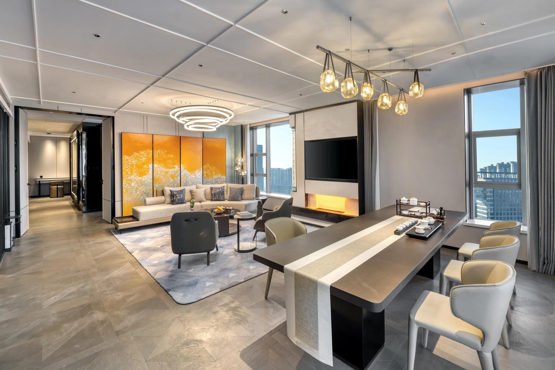 The 186 guest rooms distill regional identity further. They abstract the geometric rigor of Rugao's traditional Ban Yao kites, embedding rhombuses and triangles into carpets, headboards, and furnishings. This local aesthetic is seamlessly integrated with smart zoning for sleep, work, and leisure, serving the needs of the contemporary business guest.