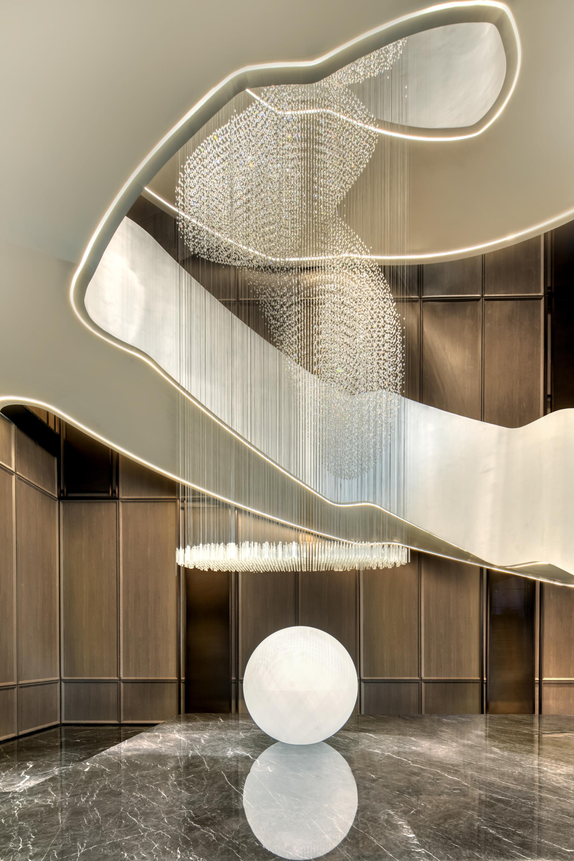The spatial choreography echoes classical garden syntax. Arrival is signaled by a minimalist canopy and textured bluestone pavement, establishing a threshold of serene anticipation. The lobby reimagines the garden's visual layering: a sculptural metal-and-glass installation evokes ancient pines, while a reception desk of bronze grilles and etched glass filters views with ritualistic transparency. Overhead, the spiral staircase is accompanied by artistic chandeliers that capture the rippling light of the garden's legendary Bowl-Washing Pool, introducing a fluid interplay of light and shadow.