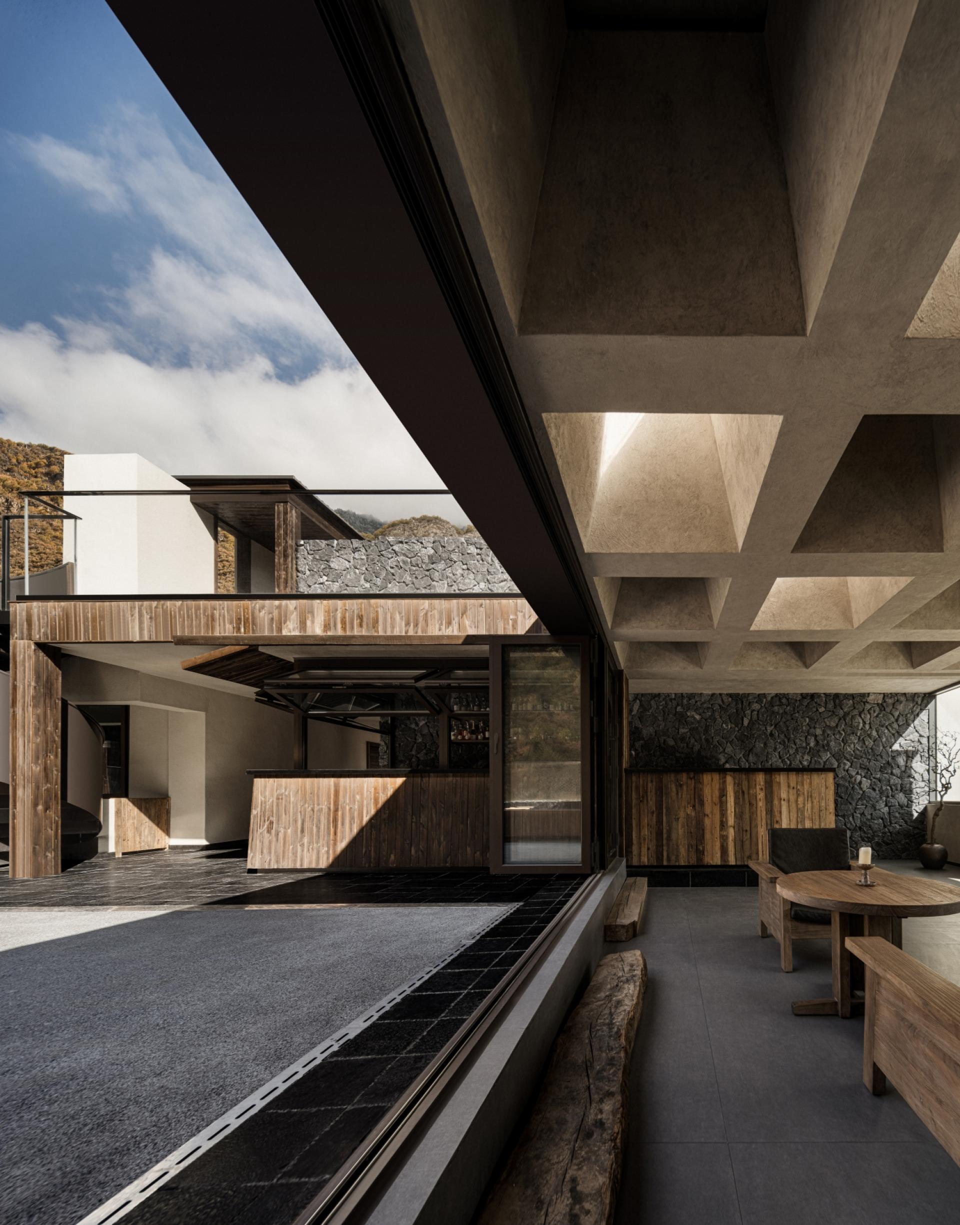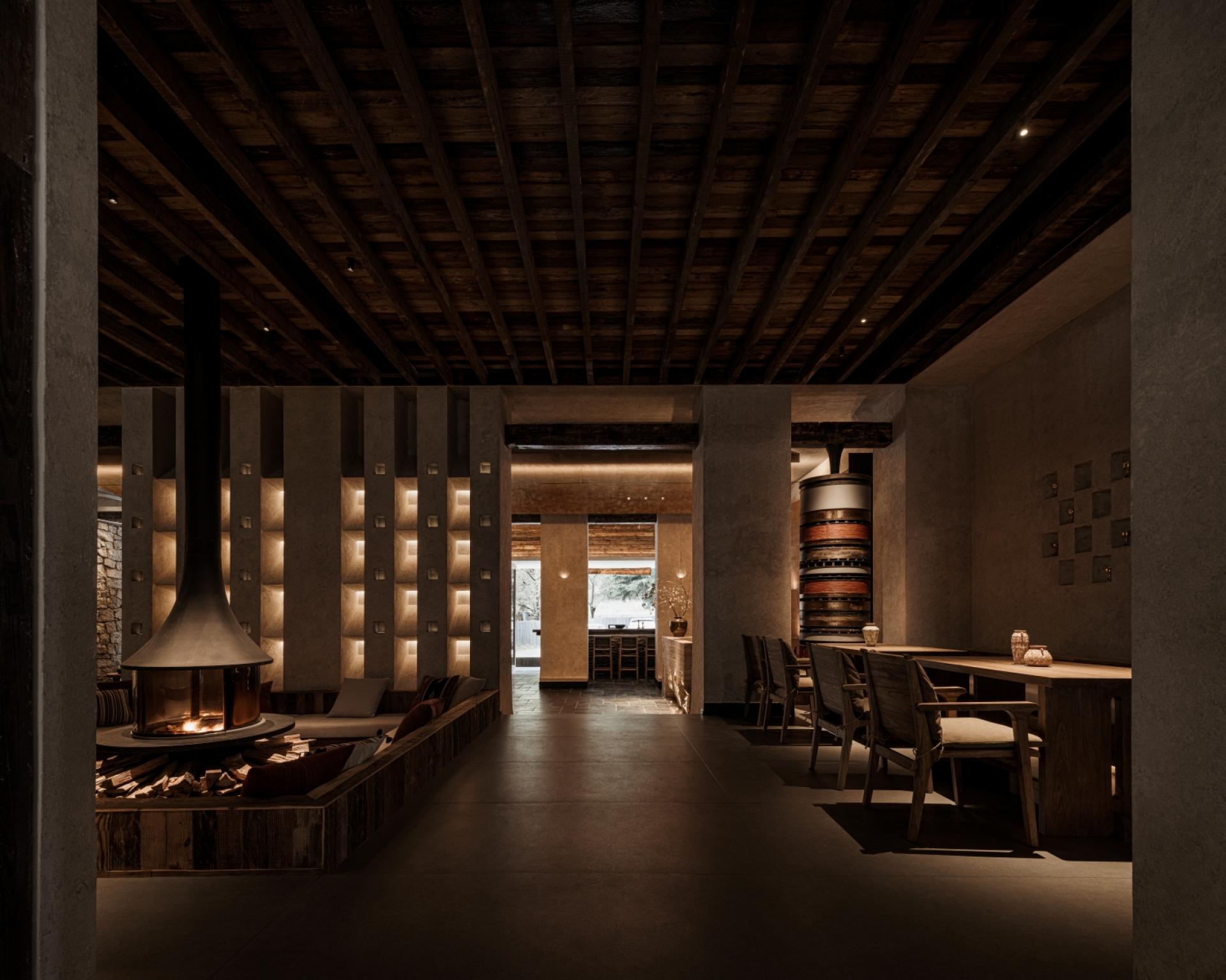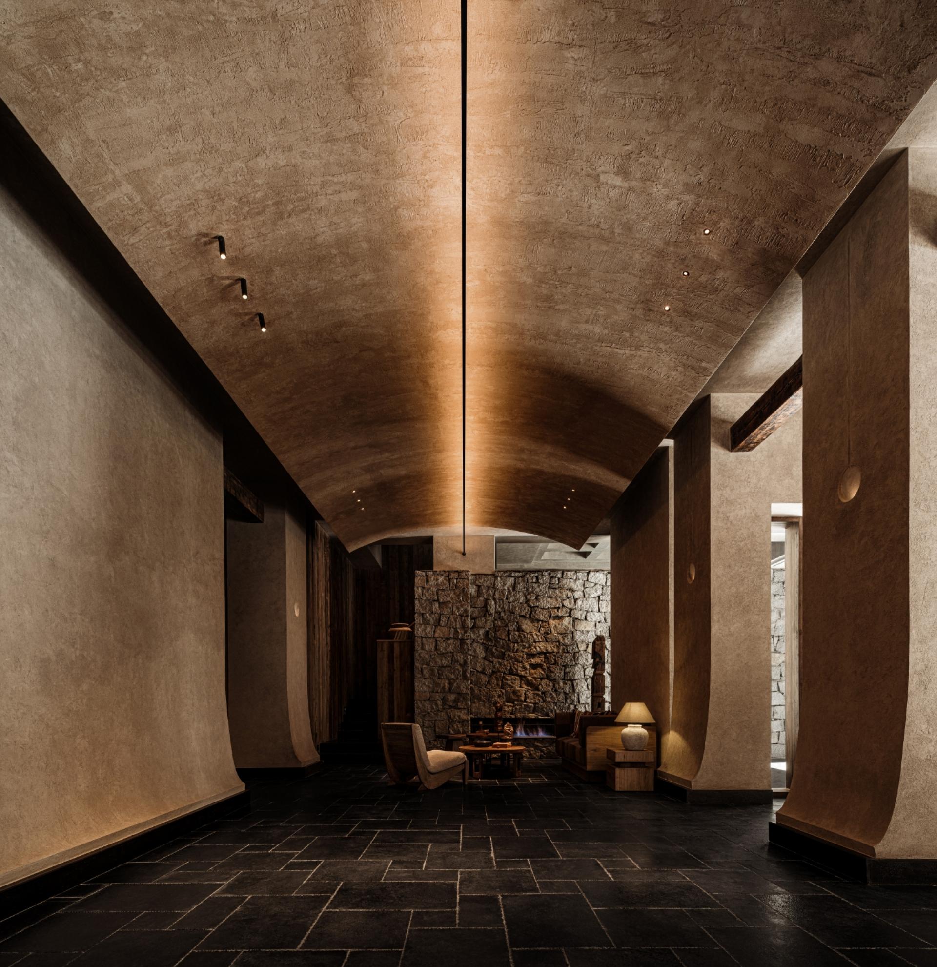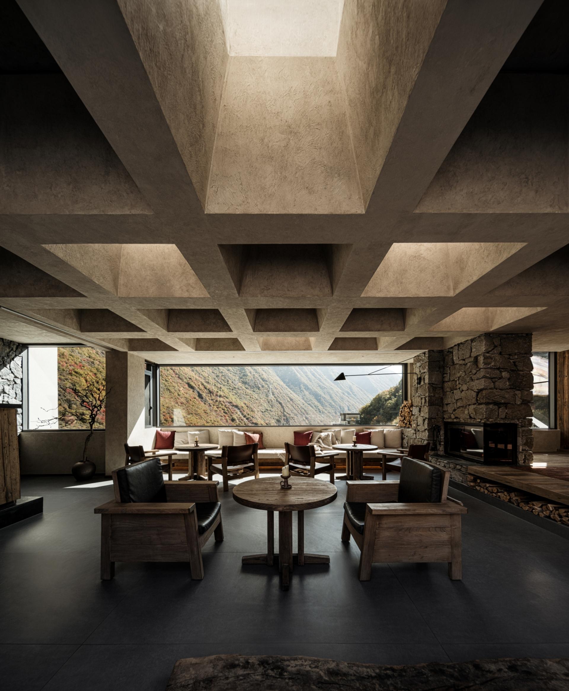 Located in Guergou, Li County, western Sichuan, Zhuodi Kangqin Hotel is a modern Tibetan cultural hotel with a total area of 4,000 square me-ters and 38 guest rooms, adjacent to National Highway 317. Centered on Highway 317 and Tibetan culture, the hotel designs its space by drawing on Tibetan beliefs, nature worship and ethnic symbols, integrat-ing sacredness into the daily life and spiritual pursuits of the Tibetan people. A dim L-shaped passage creates a transition from the hustle and bustle to tranquility. The core colonnade space blends Western classical proportions with the divinity of Tibetan architecture, establish-ing a sacred sense of ritual through symmetrical order, while the layout extends from symmetry to asymmetry to balance spatial layers and visual rhythm. The sunken hearth area at the diagonal embodies hu-manistic warmth, and details such as prayer wheels and copper art decorations integrate sacredness with daily life. The top-floor bar ech-oes the ground-floor design through grid-like openings, embracing the mountain scenery and natural light. The semi-open space enhances the connection between nature and divinity with stone and wood materials and antique columns. The solemn sacredness of public spaces and the quiet comfort of guest rooms form a harmonious contrast, offering a Tibetan spiritual baptism along National Highway 317.