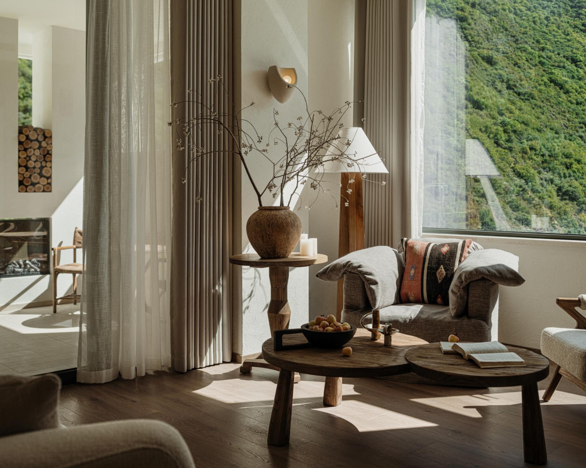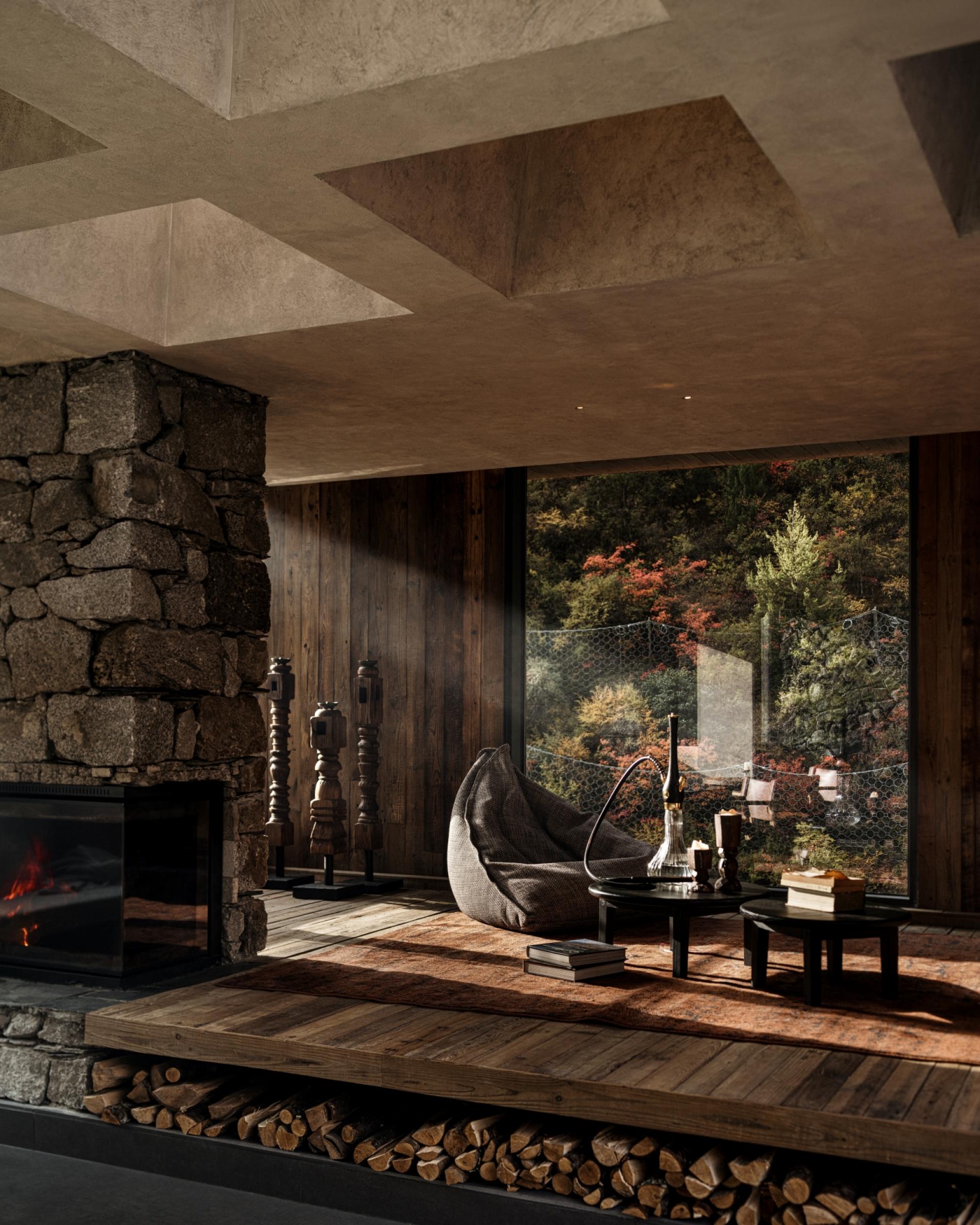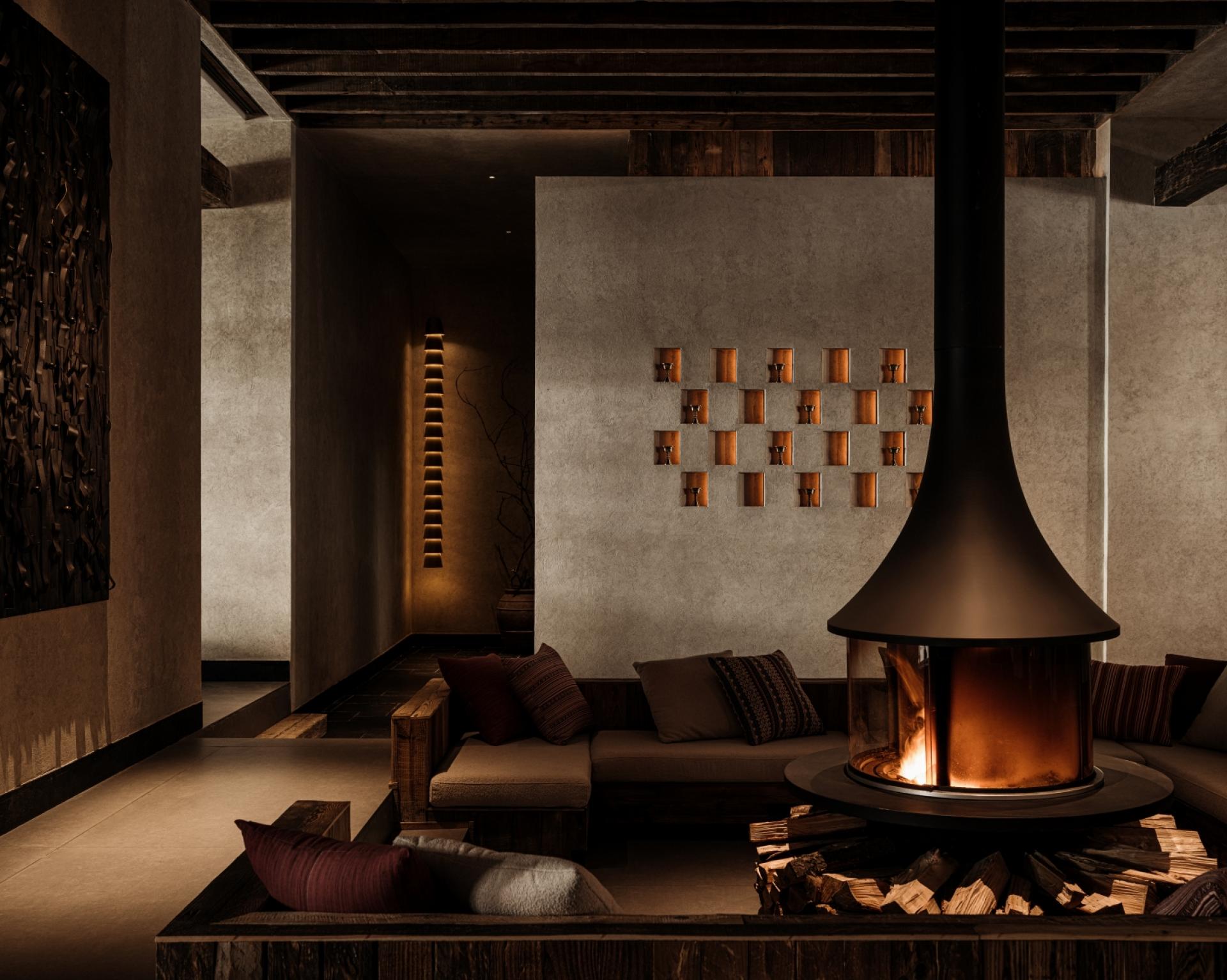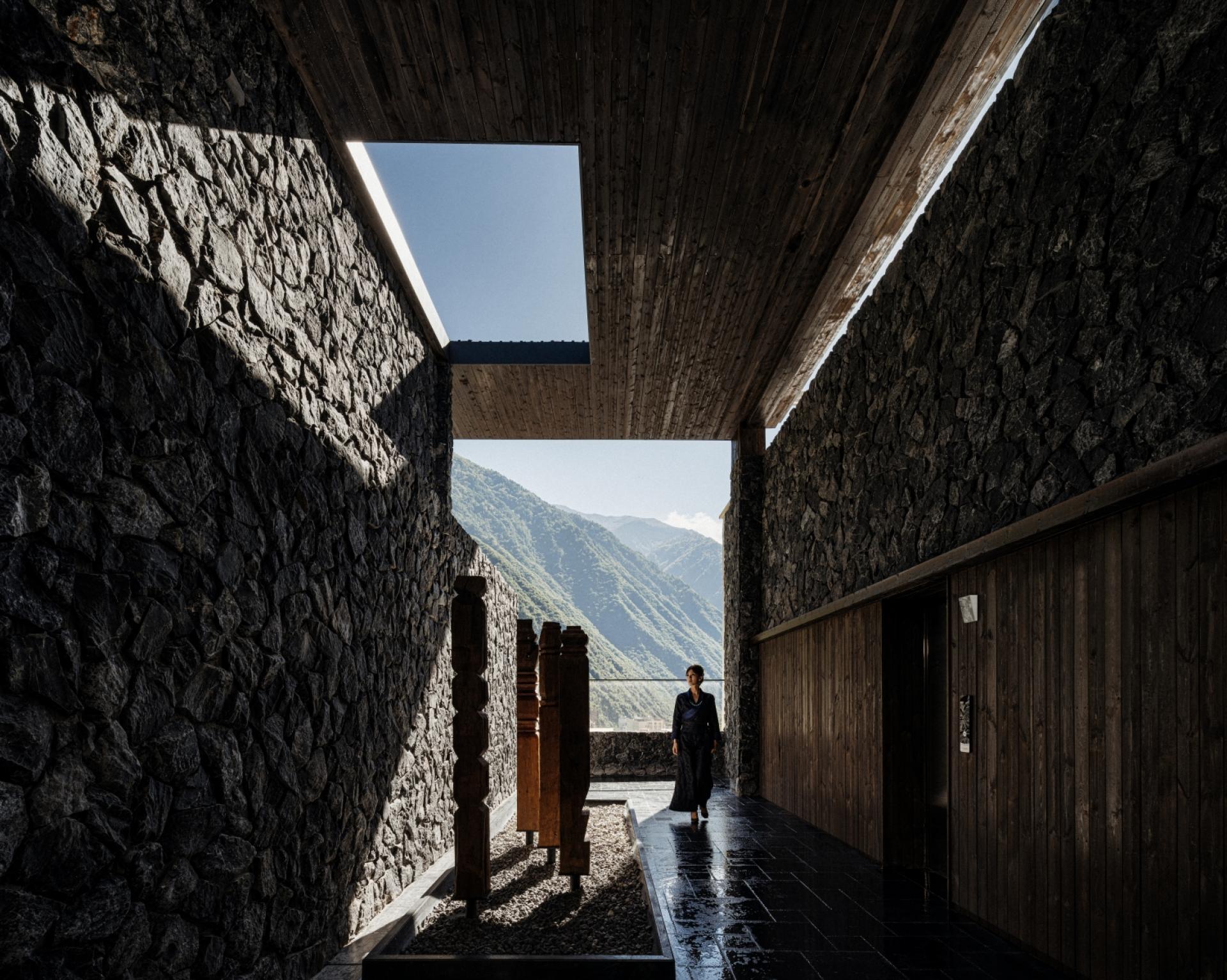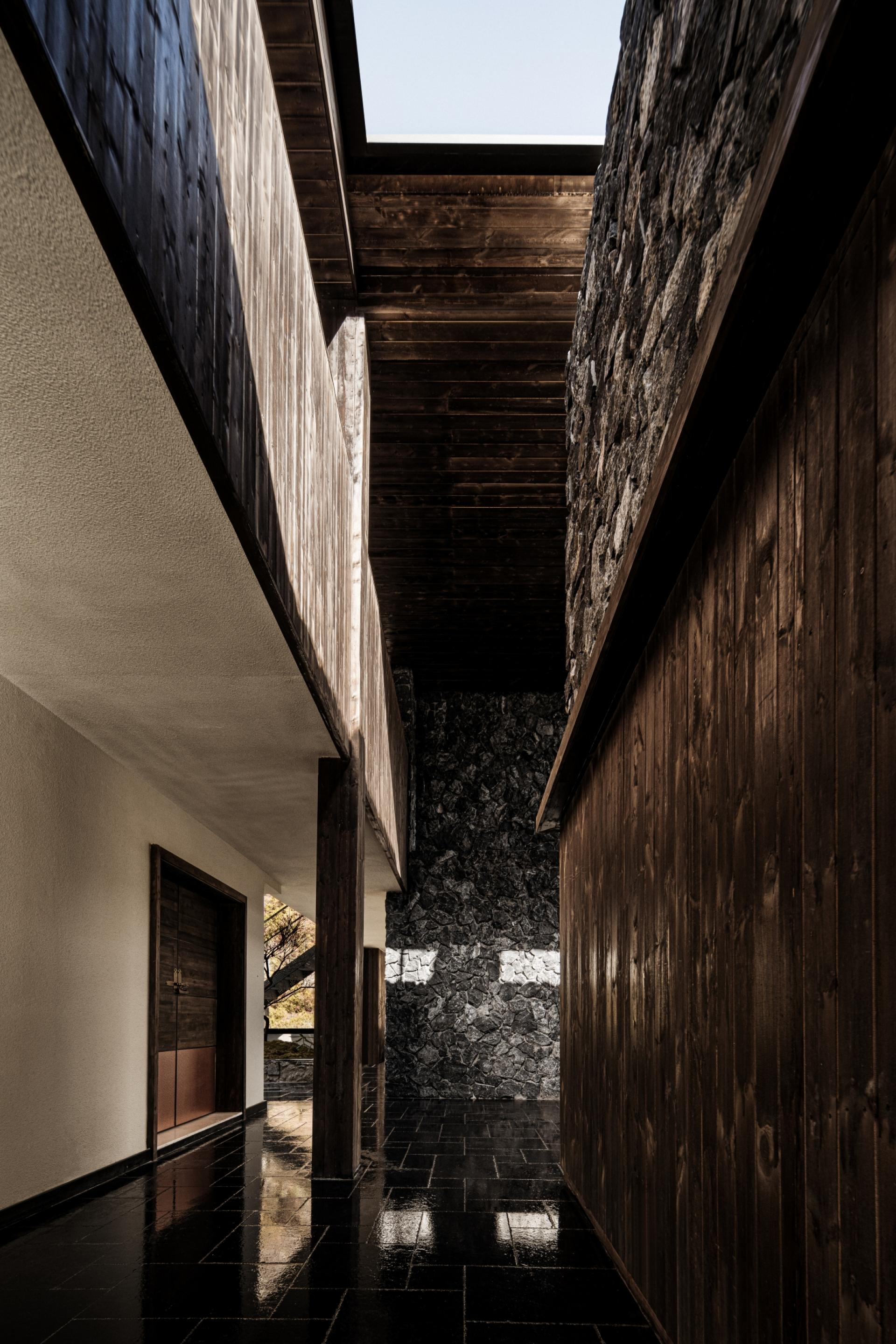 Located in Guergou, Li County, western Sichuan, Zhuodi Kangqin Hotel is a modern Tibetan cultural hotel with a total area of 4,000 square me-ters and 38 guest rooms, adjacent to National Highway 317. Centered on Highway 317 and Tibetan culture, the hotel designs its space by drawing on Tibetan beliefs, nature worship and ethnic symbols, integrat-ing sacredness into the daily life and spiritual pursuits of the Tibetan people. A dim L-shaped passage creates a transition from the hustle and bustle to tranquility. The core colonnade space blends Western classical proportions with the divinity of Tibetan architecture, establish-ing a sacred sense of ritual through symmetrical order, while the layout extends from symmetry to asymmetry to balance spatial layers and visual rhythm. The sunken hearth area at the diagonal embodies hu-manistic warmth, and details such as prayer wheels and copper art decorations integrate sacredness with daily life. The top-floor bar ech-oes the ground-floor design through grid-like openings, embracing the mountain scenery and natural light. The semi-open space enhances the connection between nature and divinity with stone and wood materials and antique columns. The solemn sacredness of public spaces and the quiet comfort of guest rooms form a harmonious contrast, offering a Tibetan spiritual baptism along National Highway 317.